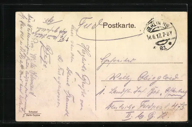 Personenbezogene Daten auf der Rückseite der Karte wurden durch blauen Textmarker unkenntlich gemacht. Die blauen Stellen sind auf die Vorderseite durchgeweicht und wirken sich negativ auf das Postkartenfoto aus