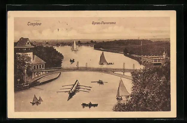AK Berlin-Treptow, Spree-Panorama mit Segelbooten