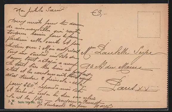 Personenbezogene Daten auf der Rückseite der Karte wurden durch blauen Textmarker unkenntlich gemacht. Die blauen Stellen sind auf die Vorderseite durchgeweicht und wirken sich negativ auf das Postkartenfoto aus