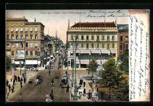 AK Berlin, Unter den Linden Ecke Friedrichstrasse, Victoria Hotel