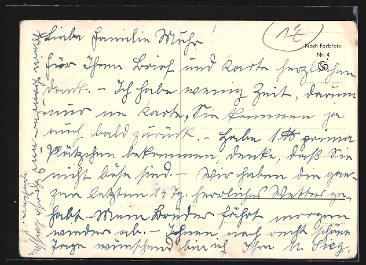 Personenbezogene Daten auf der Rückseite der Karte wurden durch blauen Textmarker unkenntlich gemacht. Die blauen Stellen sind auf die Vorderseite durchgeweicht und wirken sich negativ auf das Postkartenfoto aus