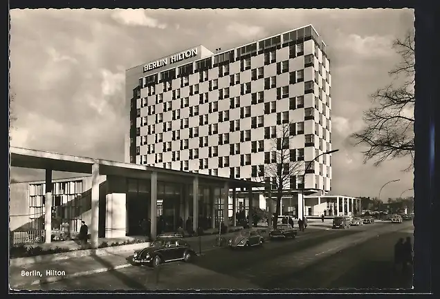 AK Berlin, VW Käfer am Strassenrand vor dem Hotel Hilton
