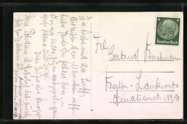 Personenbezogene Daten auf der Rückseite der Karte wurden durch blauen Textmarker unkenntlich gemacht. Die blauen Stellen sind auf die Vorderseite durchgeweicht und wirken sich negativ auf das Postkartenfoto aus