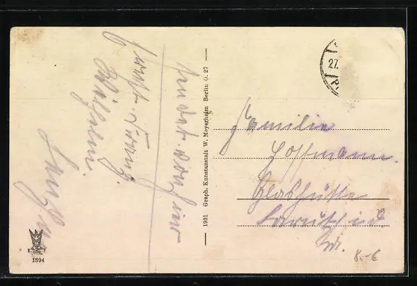 Personenbezogene Daten auf der Rückseite der Karte wurden durch blauen Textmarker unkenntlich gemacht. Die blauen Stellen sind auf die Vorderseite durchgeweicht und wirken sich negativ auf das Postkartenfoto aus