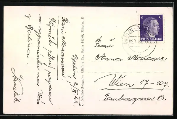 Personenbezogene Daten auf der Rückseite der Karte wurden durch blauen Textmarker unkenntlich gemacht. Die blauen Stellen sind auf die Vorderseite durchgeweicht und wirken sich negativ auf das Postkartenfoto aus