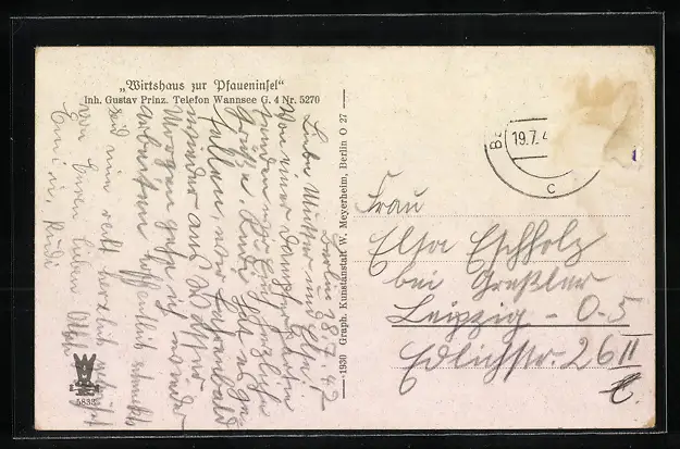 Personenbezogene Daten auf der Rückseite der Karte wurden durch blauen Textmarker unkenntlich gemacht. Die blauen Stellen sind auf die Vorderseite durchgeweicht und wirken sich negativ auf das Postkartenfoto aus