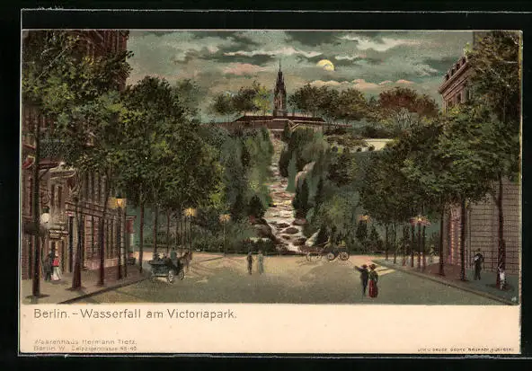 AK Berlin, Wasserfall am Viktoriapark bei Nacht