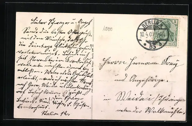 Personenbezogene Daten auf der Rückseite der Karte wurden durch blauen Textmarker unkenntlich gemacht. Die blauen Stellen sind auf die Vorderseite durchgeweicht und wirken sich negativ auf das Postkartenfoto aus