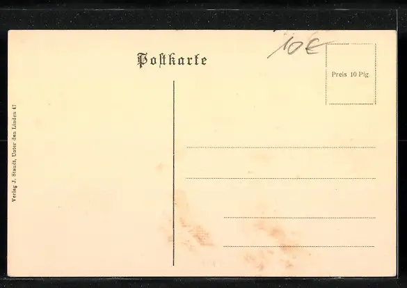Personenbezogene Daten auf der Rückseite der Karte wurden durch blauen Textmarker unkenntlich gemacht. Die blauen Stellen sind auf die Vorderseite durchgeweicht und wirken sich negativ auf das Postkartenfoto aus