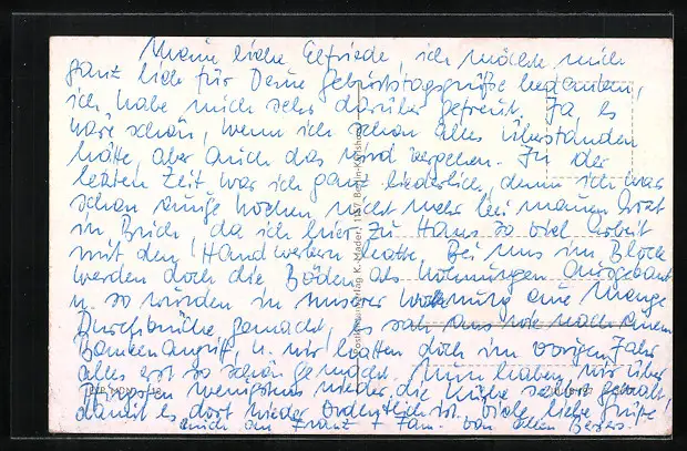 Personenbezogene Daten auf der Rückseite der Karte wurden durch blauen Textmarker unkenntlich gemacht. Die blauen Stellen sind auf die Vorderseite durchgeweicht und wirken sich negativ auf das Postkartenfoto aus
