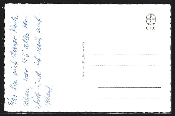Personenbezogene Daten auf der Rückseite der Karte wurden durch blauen Textmarker unkenntlich gemacht. Die blauen Stellen sind auf die Vorderseite durchgeweicht und wirken sich negativ auf das Postkartenfoto aus