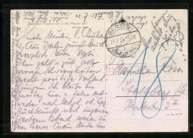 gelaufen als Feldpost 1953, Eckknick oben re., guter Zustand