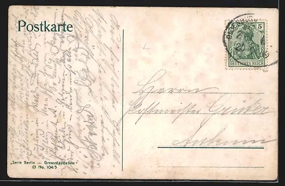 Personenbezogene Daten auf der Rückseite der Karte wurden durch blauen Textmarker unkenntlich gemacht. Die blauen Stellen sind auf die Vorderseite durchgeweicht und wirken sich negativ auf das Postkartenfoto aus