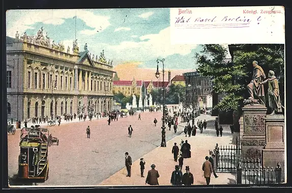 AK Berlin, Zeughaus, Strassenpartie mit Omnibus, Denkmal und Passanten