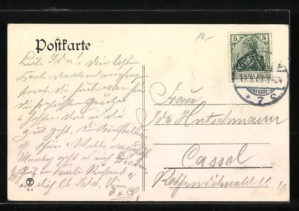 Personenbezogene Daten auf der Rückseite der Karte wurden durch blauen Textmarker unkenntlich gemacht. Die blauen Stellen sind auf die Vorderseite durchgeweicht und wirken sich negativ auf das Postkartenfoto aus
