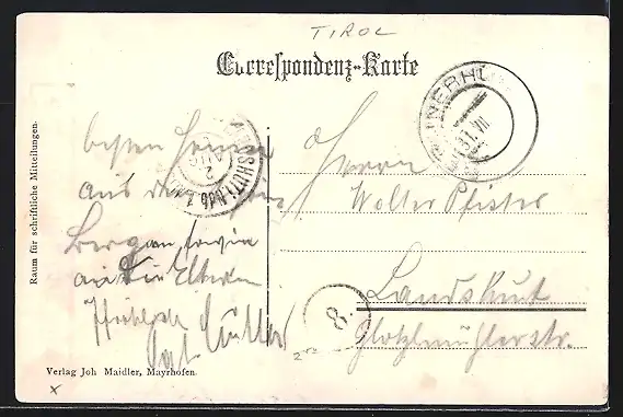 Personenbezogene Daten auf der Rückseite der Karte wurden durch blauen Textmarker unkenntlich gemacht. Die blauen Stellen sind auf die Vorderseite durchgeweicht und wirken sich negativ auf das Postkartenfoto aus