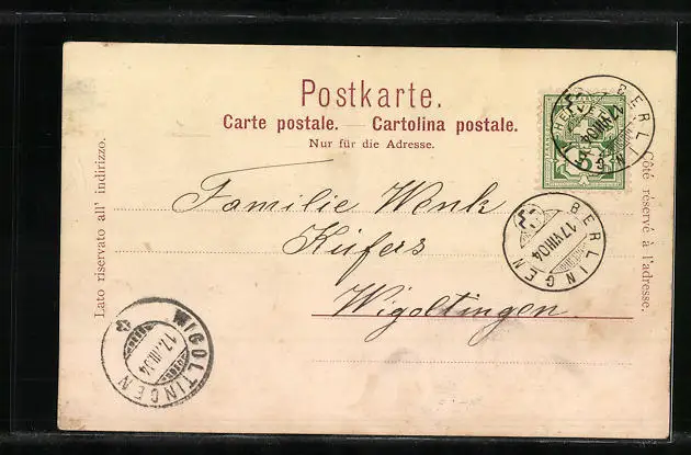 alte Ansichtskarte, gelaufen 1904, Bugspur mittig, Eckknick re. unten, guter Zustand
