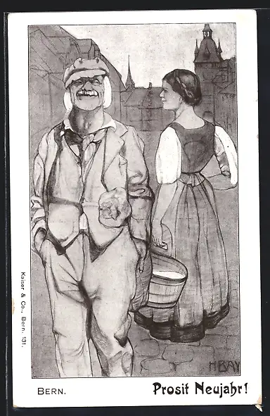 AK Bern, Bäuerin mit Milcheimer und Mann, Stadttyp