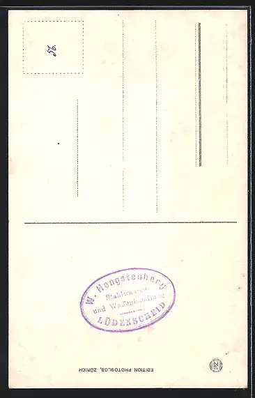 Personenbezogene Daten auf der Rückseite der Karte wurden durch blauen Textmarker unkenntlich gemacht. Die blauen Stellen sind auf die Vorderseite durchgeweicht und wirken sich negativ auf das Postkartenfoto aus