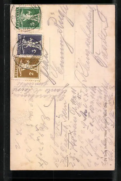 Personenbezogene Daten auf der Rückseite der Karte wurden durch blauen Textmarker unkenntlich gemacht. Die blauen Stellen sind auf die Vorderseite durchgeweicht und wirken sich negativ auf das Postkartenfoto aus