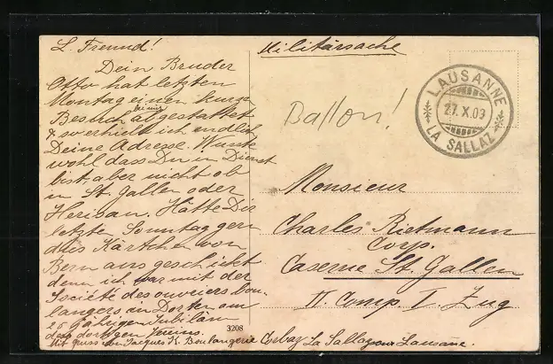 Personenbezogene Daten auf der Rückseite der Karte wurden durch blauen Textmarker unkenntlich gemacht. Die blauen Stellen sind auf die Vorderseite durchgeweicht und wirken sich negativ auf das Postkartenfoto aus