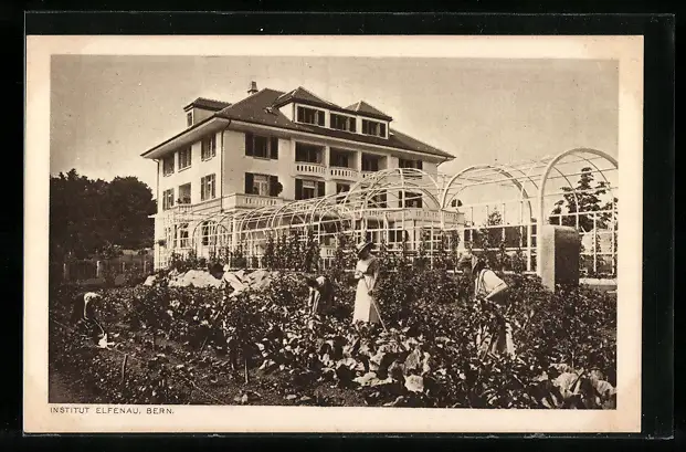 AK Bern, Institut Elfenau, Gartenansicht mit gärtnernden Damen