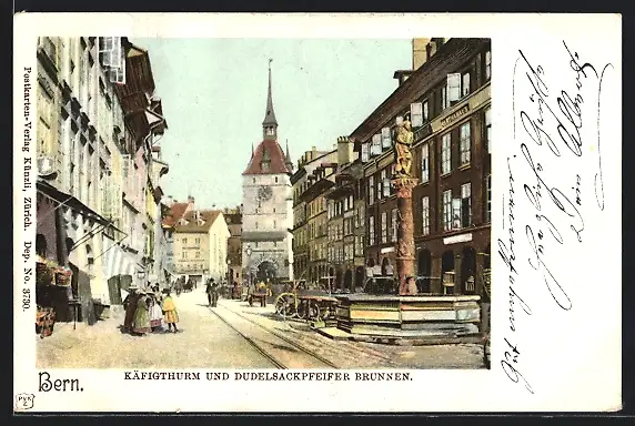 AK Bern, Käfigthurm und Dudelsackpfeifer Brunnen