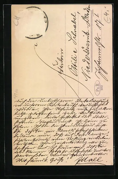 Personenbezogene Daten auf der Rückseite der Karte wurden durch blauen Textmarker unkenntlich gemacht. Die blauen Stellen sind auf die Vorderseite durchgeweicht und wirken sich negativ auf das Postkartenfoto aus