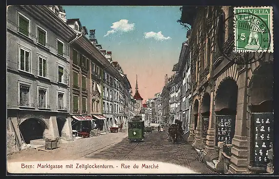 AK Bern, Marktgasse mit Zeitglockenturm und Strassenbahn