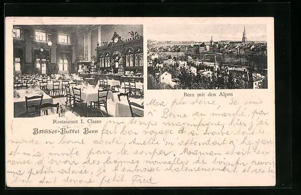 AK Bern, Ortsansicht mit Alpen, Bahnhof-Buffet, Restaurant I. Classe