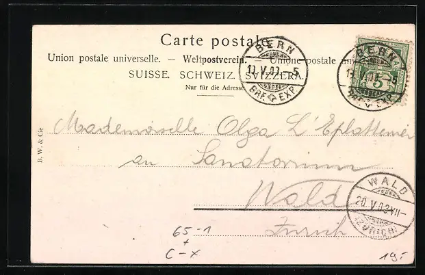 Personenbezogene Daten auf der Rückseite der Karte wurden durch blauen Textmarker unkenntlich gemacht. Die blauen Stellen sind auf die Vorderseite durchgeweicht und wirken sich negativ auf das Postkartenfoto aus
