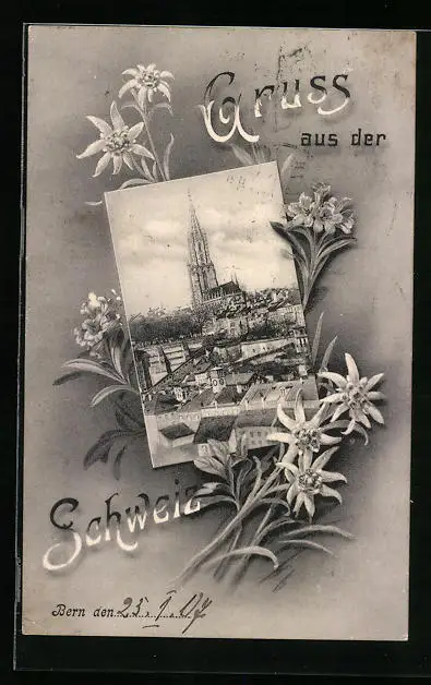 AK Bern, Ortsansicht mit Kirche, Blumenmotiv