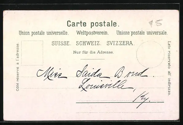 Personenbezogene Daten auf der Rückseite der Karte wurden durch blauen Textmarker unkenntlich gemacht. Die blauen Stellen sind auf die Vorderseite durchgeweicht und wirken sich negativ auf das Postkartenfoto aus