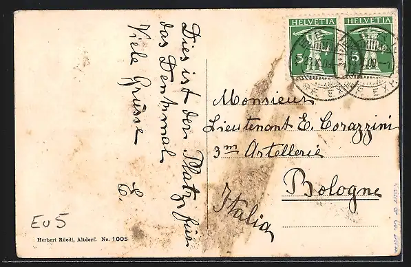 Personenbezogene Daten auf der Rückseite der Karte wurden durch blauen Textmarker unkenntlich gemacht. Die blauen Stellen sind auf die Vorderseite durchgeweicht und wirken sich negativ auf das Postkartenfoto aus