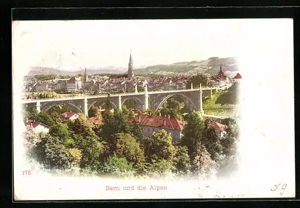 AK Bern, Teilansicht mit Brücke und den Alpen