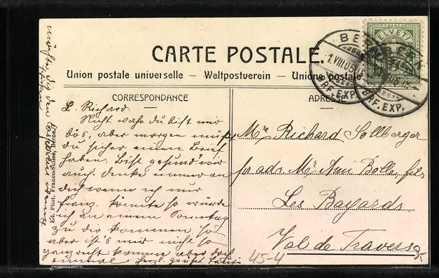 Personenbezogene Daten auf der Rückseite der Karte wurden durch blauen Textmarker unkenntlich gemacht. Die blauen Stellen sind auf die Vorderseite durchgeweicht und wirken sich negativ auf das Postkartenfoto aus