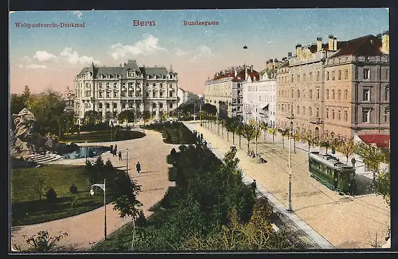 AK Bern, Weltpostverein-Denkmal, Bundesgasse und Strassenbahn