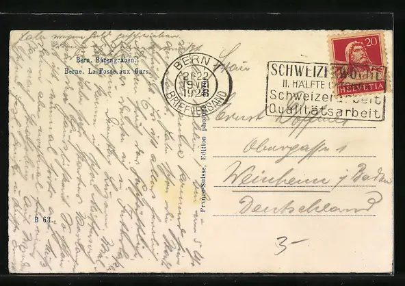 Personenbezogene Daten auf der Rückseite der Karte wurden durch blauen Textmarker unkenntlich gemacht. Die blauen Stellen sind auf die Vorderseite durchgeweicht und wirken sich negativ auf das Postkartenfoto aus