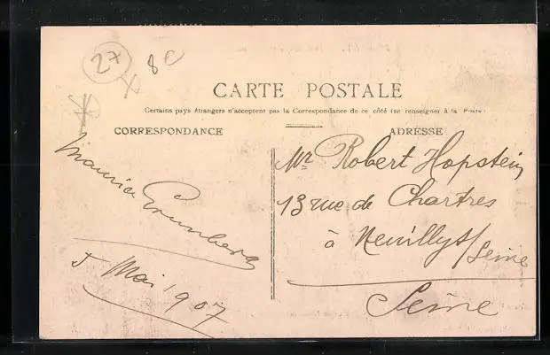 Personenbezogene Daten auf der Rückseite der Karte wurden durch blauen Textmarker unkenntlich gemacht. Die blauen Stellen sind auf die Vorderseite durchgeweicht und wirken sich negativ auf das Postkartenfoto aus