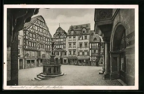 AK Berncastel a. d. Mosel, Marktplatz mit Geschäften und Denkmal
