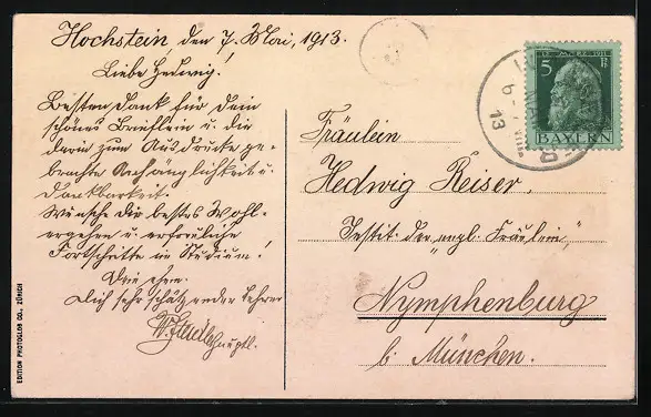 Personenbezogene Daten auf der Rückseite der Karte wurden durch blauen Textmarker unkenntlich gemacht. Die blauen Stellen sind auf die Vorderseite durchgeweicht und wirken sich negativ auf das Postkartenfoto aus