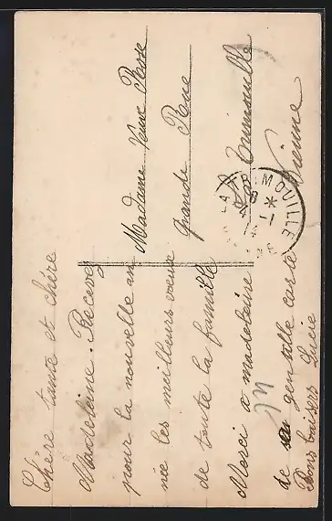 Personenbezogene Daten auf der Rückseite der Karte wurden durch blauen Textmarker unkenntlich gemacht. Die blauen Stellen sind auf die Vorderseite durchgeweicht und wirken sich negativ auf das Postkartenfoto aus