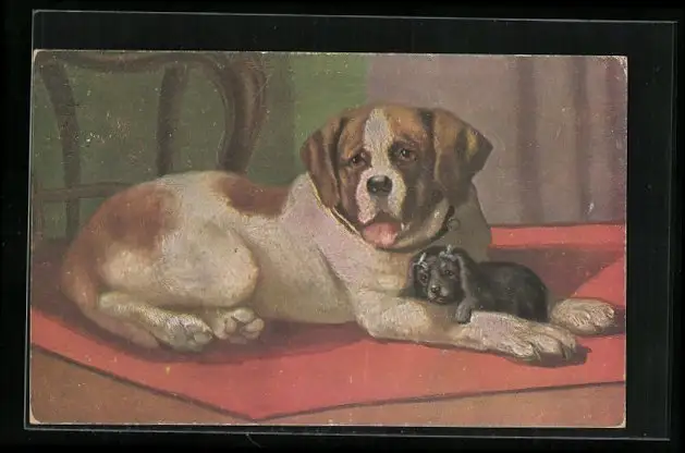 AK Bernhardiner mit einem kleinen schwarzen Welpen