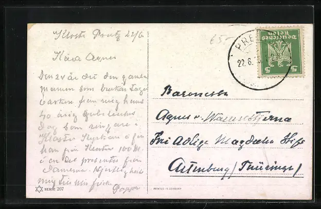 Personenbezogene Daten auf der Rückseite der Karte wurden durch blauen Textmarker unkenntlich gemacht. Die blauen Stellen sind auf die Vorderseite durchgeweicht und wirken sich negativ auf das Postkartenfoto aus