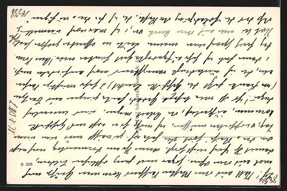 Personenbezogene Daten auf der Rückseite der Karte wurden durch blauen Textmarker unkenntlich gemacht. Die blauen Stellen sind auf die Vorderseite durchgeweicht und wirken sich negativ auf das Postkartenfoto aus
