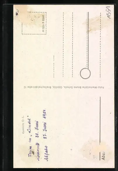 Personenbezogene Daten auf der Rückseite der Karte wurden durch blauen Textmarker unkenntlich gemacht. Die blauen Stellen sind auf die Vorderseite durchgeweicht und wirken sich negativ auf das Postkartenfoto aus
