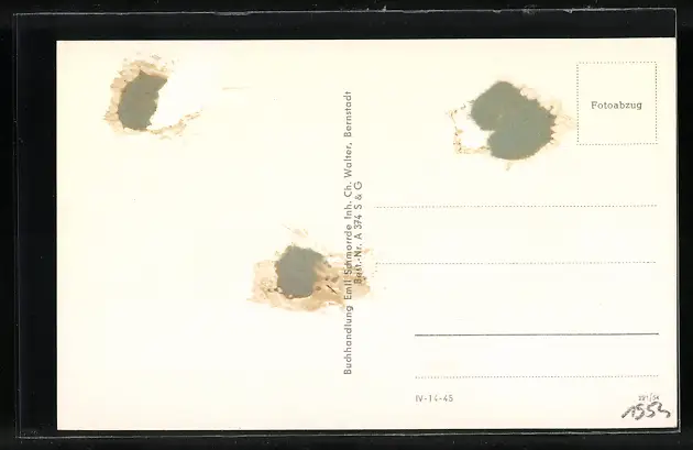 Personenbezogene Daten auf der Rückseite der Karte wurden durch blauen Textmarker unkenntlich gemacht. Die blauen Stellen sind auf die Vorderseite durchgeweicht und wirken sich negativ auf das Postkartenfoto aus
