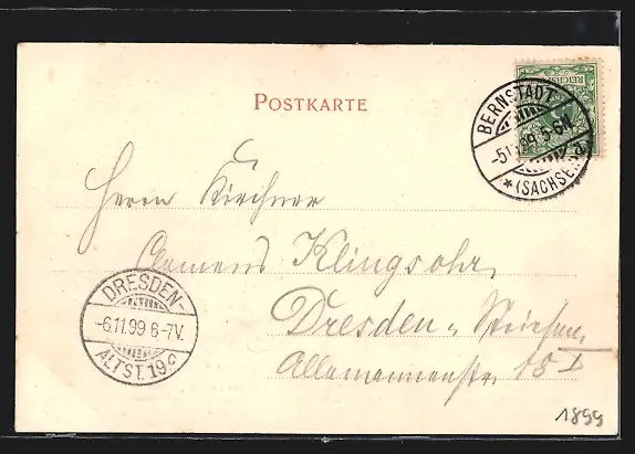 alte Ansichtskarte, gelaufen 1899, Stempelspur, guter Zustand