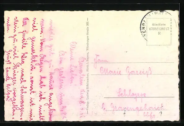 Personenbezogene Daten auf der Rückseite der Karte wurden durch blauen Textmarker unkenntlich gemacht. Die blauen Stellen sind auf die Vorderseite durchgeweicht und wirken sich negativ auf das Postkartenfoto aus