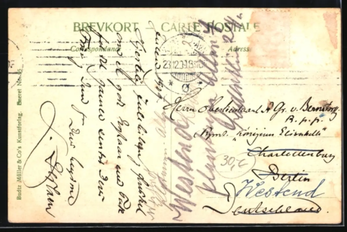 alte Ansichtskarte, gelaufen, Stempelspur, Briefmarke entfernt, rückseitig Oberflächenschaden, guter Zustand